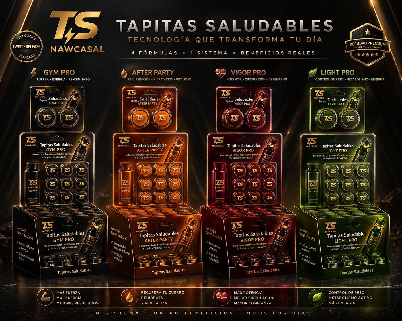 Tapitas Saludables con cápsulas PRO-CHARGE. Disponible en kit con botella (RD$1,500) o pack de 2 tapitas (RD$300).